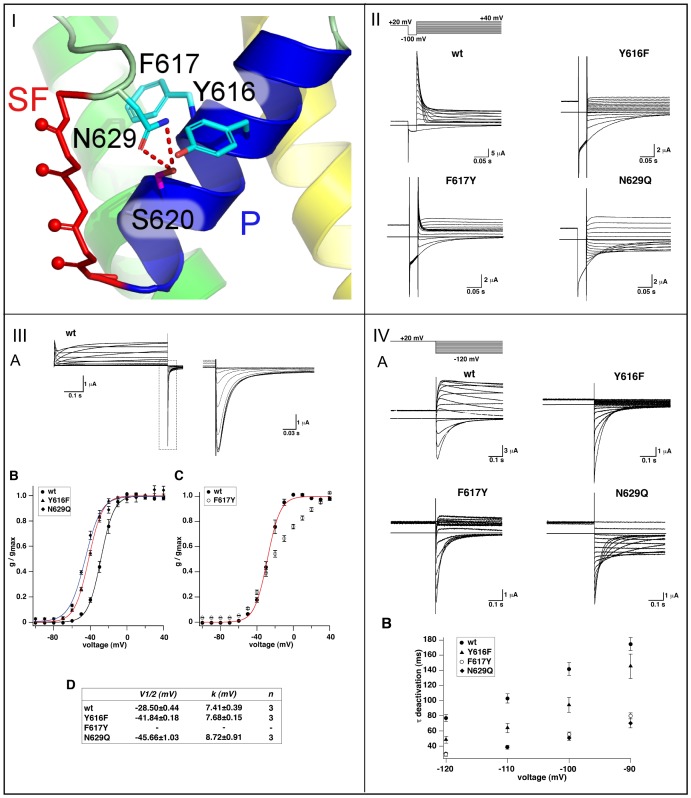 Figure 4. Mutations of the H-bond network behind the selectivity filter.(I) Mutation sites N629Q (pore loop), F617Y, and Y616F (both: pore helix, P). (II) Inactivation properties of wild-type and mutant hERG channels. Inactivation time courses for the different hERG channels were recorded as shown. A conditioning pulse to +20 mV followed by a 100 ms hyperpolarizing pulse to −100 mV preceded various depolarizing pulses from −90 to +40 mV in 10 mV increments as illustrated by the pulse protocol on top. (III) (A) Exemplary wild-type (WT) hERG current traces elicited by 6 s depolarizing voltage steps from −100 to +40 mV followed by a hyperpolarizing pulse to −140 mV. Respective tail currents are shown enlarged at left. (B) Conductance-voltage relations determined from Boltzmann fits to normalized tail current amplitudes for hERG wild-type and Y616F and N629Q mutant channels. (C) Conductance-voltage relation for the mutant hERG channel F617Y. (D) and k parameters obtained under steady state conditions from the Boltzmann fits for wild-type and mutant channels are summarized at the bottom. *p<0.05 versus wild-type. (IV) (A) Deactivation time courses of wild-type and mutant hERG channels. Tail currents were elicited according to the pulse protocol shown on top. (B) Voltage dependence of mean deactivation time constants () (n = 4) for the different channels as indicated.