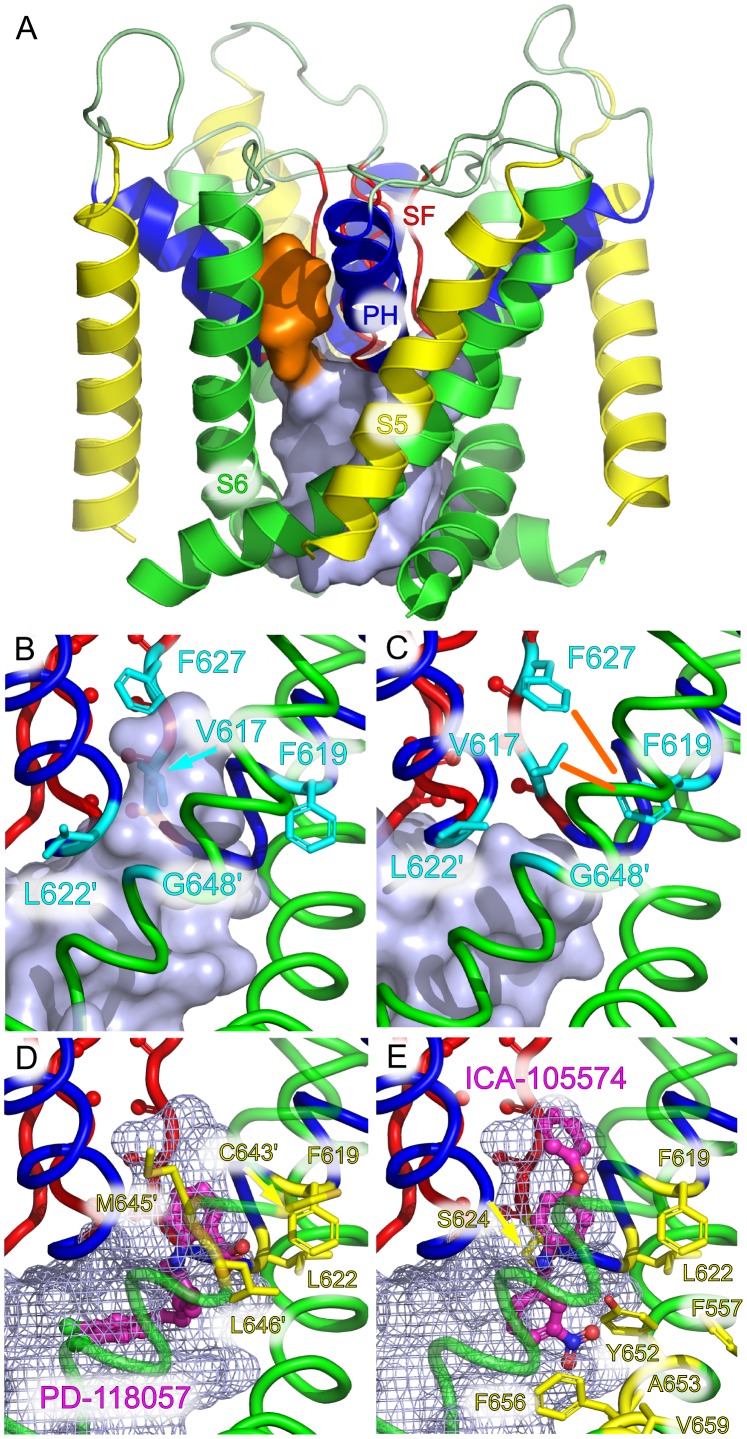Figure 5. Suggested mechanism of action for hERG activators.(A) Binding pocket for activators, shown here located between the pore helices of two adjacent subunits (orange surface). (B) The experimentally determined binding pocket for PD-118057 and ICA-105574 is located around residue F619 and extends to residue L622 (secondary subunit contacts are marked with a prime symbol). (C) A cascade of conformational changes triggered by collapse of the SF leads to constriction of the binding pocket (orange lines) and rearrangement of L622. (D) The cavity is large enough to accommodate PD-118057. All residues known to affect PD-118057 binding [23] line the pocket (yellow). (E) The activator molecule ICA-105574, shown docked to the side-pocket with residues known to influence binding in yellow.