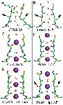 Figure 2. Selectivity filter conformations of hERG simulations and KcsA crystal structures.For clarity, only two subunits are shown. Snapshots were taken at the end of the simulations with a 5 Å N629–S620 distance (A), and a 10 Å N629–S620 distance (B). A flip of the V625 carbonyl group is seen (black arrows). For comparison, (C) displays the crystal structures of the collapsed (pdb: 1K4D) and (D) the conductive KcsA SF (pdb: 1K4C). (E) Comparison with the non-flipped (pdb: 1ZWI) and (F) flipped SF conformation (pdb: 2ATK) observed in crystal structures of the non-inactivating KcsA mutant E71A [8].