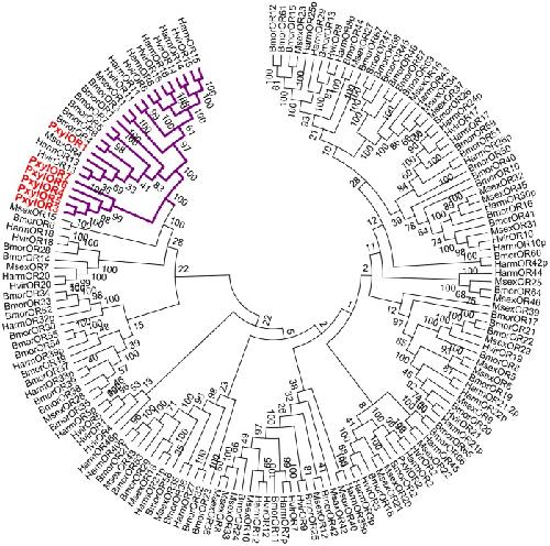Figure 2. Phylogenetic analysis of six candidate pheromone receptors.The branch colored in purple represents the sub-grouping of pheromone receptors. GenBank accession numbers are listed in Material S1.