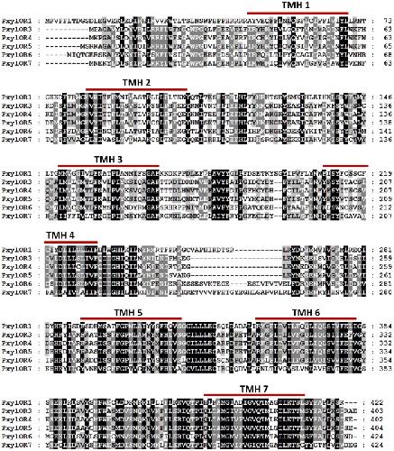 Figure 1. Sequence analysis of six candidate pheromone receptors.Seven putative trans-membrane domains are indicated with red bar and “TMH ‘n’” designation, where ‘n’ designates sequential order of the putative transmembrane domain. Trans-membrane domains were predicted by TMHMM Server v. 2.0 (http://www.cbs.dtu.dk/services/TMHMM/).