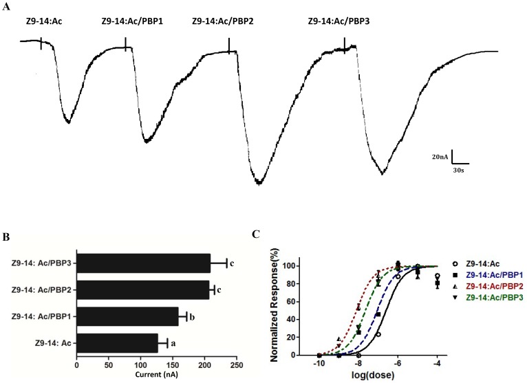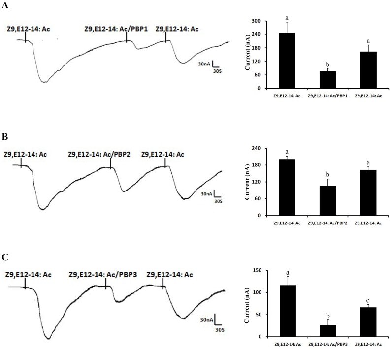 Figure 8. PxylOR4/PxylOrco Xenopus oocytes to Z9, E12-14: Ac of PxylPBP1-mediated (A), PxylPBP2-mediated (B), PxylPBP3-mediated (C)response, respectively.(Left)Inward current responses of PxylOR4/PxylOrco Xenopus oocytes in response to 10−5 M of Z9, E12-14: Ac solubilized by 1XRinger, PxylPBP and 1XRinger successively. (Right) Response profile of PxylOR4/PxylOrco Xenopus oocytes. Error bars indicate SEM (n = 3). Statistical comparison of responses of oocytes was assessed using one-way analysis of variance (ANOVA).