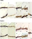 Figure 5. Expression of PxylOR1 and PxylOR4 genes in male antenna of P. xylostella.In situ hybridizations were performed with digoxigenin-labelled antisense RNA probes on longitudinal tissue sections of male antennae. Signals were visualized using an anti-DIG antibody. (A) Hybridization signals in one segment of the P. xylostella antenna are shown. (B) Negative control with a DIG-labeled sense probe. (C) Higher magnification of long trichoid sensilla with hybridization signals. (D) to (G) No hybridization signal was detected under short trichoid sensilla, basiconi sensilla, coeloconic sensilla and chaetica sensilla. Scale bars: 5 µm in A–B and 2 µm in C–G.