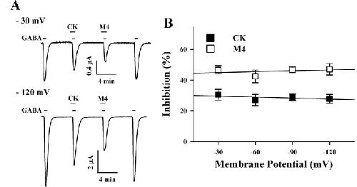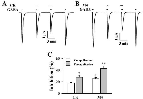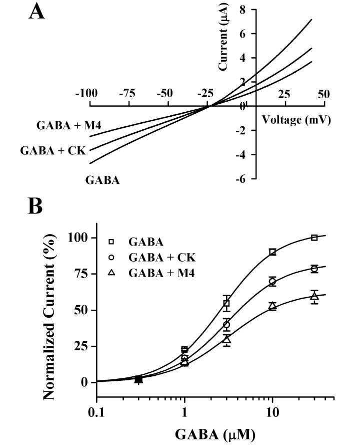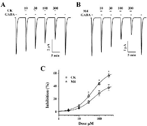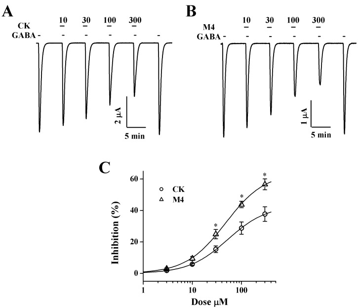 Ginsenosides, one of the active ingredients of Panax ginseng, show various pharmacological and physiological effects, and they are converted into compound K (CK) or protopanaxatriol (M4) by intestinal microorganisms. CK is a metabolite derived from protopanaxadiol (PD) ginsenosides, whereas M4 is a metabolite derived from protopanaxatriol (PT) ginsenosides. The γ-aminobutyric acid receptorC (GABAC) is primarily expressed in retinal bipolar cells and several regions of the brain. However, little is known of the effects of ginsenoside metabolites on GABAC receptor channel activity. In the present study, we examined the effects of CK and M4 on the activity of human recombinant GABAC receptor (ρ1) channels expressed in Xenopus oocytes by using a 2-electrode voltage clamp technique. In oocytes expressing GABAC receptor cRNA, we found that CK or M4 alone had no effect in oocytes. However, co-application of either CK or M4 with GABA inhibited the GABA-induced inward peak current (IGABA ). Interestingly, pre-application of M4 inhibited IGABA more potently than CK in a dose-dependent and reversible manner. The half-inhibitory concentration (IC50) values of CK and M4 were 52.1±2.3 and 45.7±3.9 µM, respectively. Inhibition of IGABA by CK and M4 was voltage-independent and non-competitive. This study implies that ginsenoside metabolites may regulate GABAC receptor channel activity in the brain, including in the eyes.