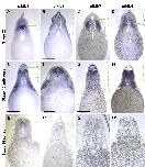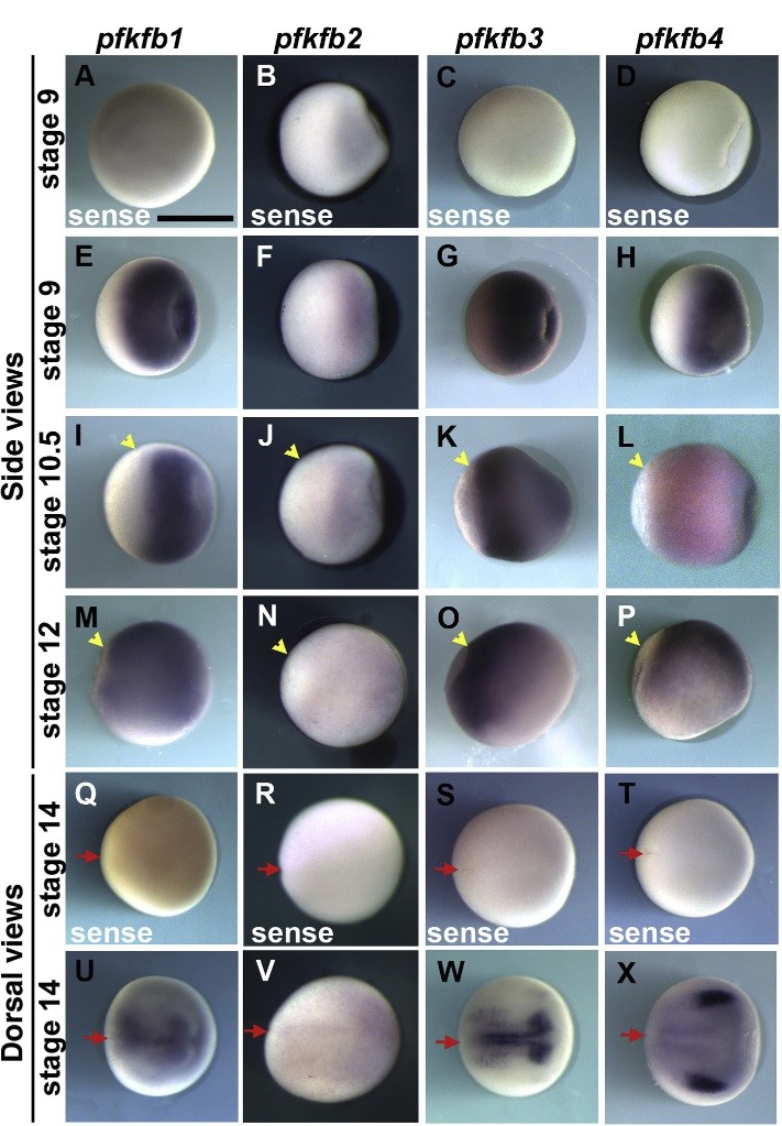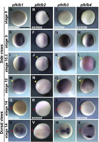 Fig. 4. Pfkfb genes expression patterns during early Xenopus laevis development. WISH is shown for embryos at blastula stage 9 (A) (lateral view, animal pole to the right), at gastrula stage 10, 5 and 12 (I) (lateral view, anterior to the right) and at neurula stage 14 (Q) (dorsal view, anterior to the right). Embryos stained with control sense probes are shown for stage 9 (A) and stage 14 (Q). Yellow arrowheads indicate the dorsal blastopore lip and red arrows indicate the blastopore. Bar = 1 mm. |