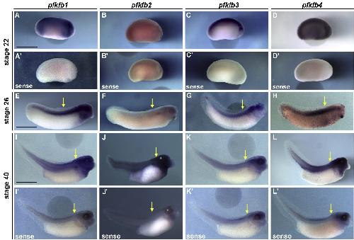 Fig. 5. Pfkfb genes expression patterns during late Xenopus laevis development. The four pfkfb genes are analysed at tailbud stage 22 (A0), at young tadpole stage 26 (E-H) and at swimming tadpole stage 40 (I0 ). Embryos stained with a control sense probe are shown in A0 0 and I0 0 . All the embryos are shown in a lateral view, anterior to the right. Magnification of stage 40 heads are shown in Supplemental Fig. 4. Arrows indicate the level of the transverse section shown in Fig. 6. Bar = 1 mm. |