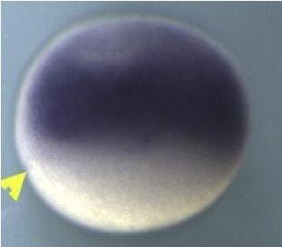 pfkfb1 ( 6-phosphofructo-2-kinase/fructose-2,6-biphosphatase 1 ) gene expression in Xenopus laevis embryos, NF stage 9, as assayed by in situ hybridization, anterior top. |
