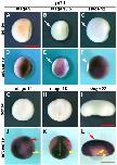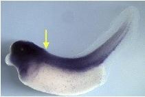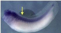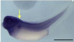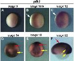 lateral view, dorsal on top (white arrows indicate the blastopore lip); (D) Embryos at neurula stages 14 and 18 shown in dorsal view, anterior on the bottom (red arrows indicate the neural plate and yellow arrows the neural crest and the preplacodal field). (F) Stage 22 tailbud embryo shown in lateral view, anterior on the right (red arrow indicates the dorsal side of the embryo; yellow arrows indicate the prospective craniofacial region). Bar = 1 mm. |