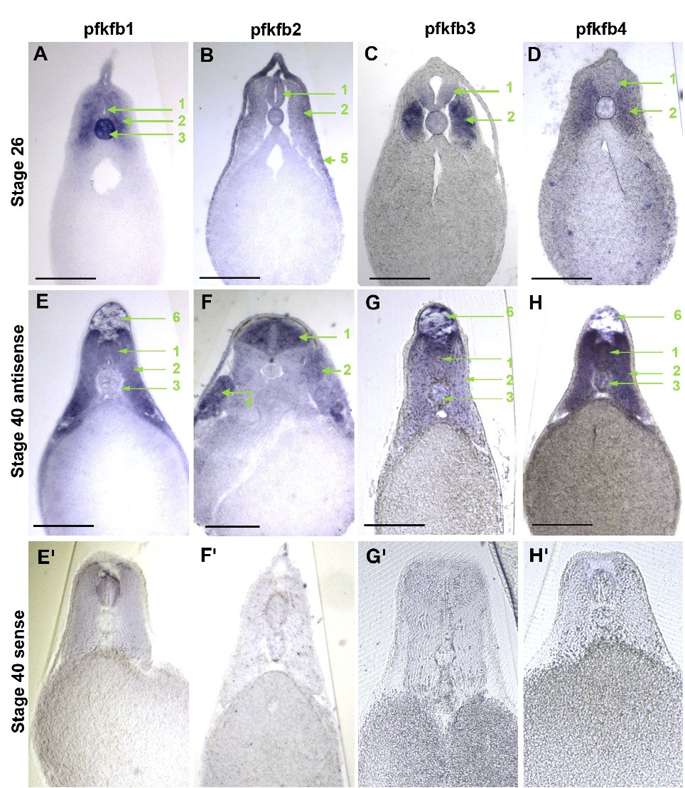 Fig. 6. Transverse sections at tadpole stages indicate tissue specific pfkfb gene expression. Transverse sections of embryos at tadpole stages 26 and 40 have been performed after a WISH for pfkfb1 (A, E), 2 (B,F), 3 (C, G) and 4 (D, H). Arrow 1 indicates the neural tube, arrow 2 indicates the somites, arrow 3 indicates the notochord, arrow 4 indicates the pronephros, arrow 5 indicates the ectoderm, arrow 6 shows the dorsal fin. E0 0 show sense probe controls. Bar = 200 lm. |