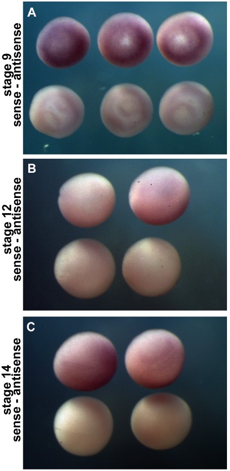 Pfkfb2 expression pattern in early X. laevis embryos. Pfkfb2 expression pattern is shown at stage 9 (A) (animal pole views), stage 12 (B, dorsal views, posterior to the left) and stage 14 (C) (dorsal views, posterior to the left). Embryos stained with sense (bottom) and anti-sense (top) probe are compared. |