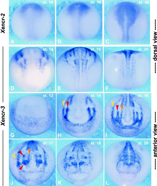 Fig. 3. Early expression of Xencr-2 and Xencr-3. (AâC) Dorsal view of Xencr-2 during neurula stages, anterior side up. (A) st. 14. (B) st. 16. (C) st. 20. Xencr-2 is a pan-neural marker with exception to the midline of the neural plate. (DâF) Dorsal view of Xencr-3 during neurulation, anterior side up. (D) st. 14. (E) st. 16. (F) st. 20. Xencr-3 expression is seen in prospective neural crest populations along the neural plate border in intermedio-lateraldeepneuroectoderm cells ([Schroeder, 1970]). (GâL) Anterior view of Xencr-3 during gastrula and neurula stages, dorsal side up. (G) st. 12. (H) st. 14. (I) st. 16. (J) st. 17. (K) st. 18. (L) st. 20. (G) Light expression is detected during mid-gastrulation but (H) is quickly upregulated in the otic and profundalâtrigeminal placode primordia (red arrowhead) as well as the epibranchial/lateral line placode primordia (yellow arrowhead) at the beginning of neurulation ([Schlosser and Northcutt, 2000]). (I) Expression in neural crest cells along the anterior neural crest border (orange arrowhead) is seen at st. 16. (JâL) The profundal and trigeminal placodes (bottom red arrowhead) become distinct from the otic placode (top red arrowhead) by the end of neurulation.