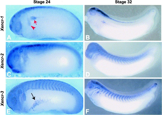 Fig. 4. Later expression of Xencr-1, Xencr-2, and Xencr-3. (AâF) Lateral view, anterior to the left. (A) Xencr-1, st. 24 (B) Xencr-1, st. 32. (C) Xencr-2, st. 24. (D) Xencr-2, st. 32. (E) Xencr-3, st. 24. (F) Xencr-3, st. 32. (AâB) Xencr-1 shows expression in the dorsal neural tube, optic vesicle, migrating branchial arch neural crest cells (red arrowhead), pronephric anlage (red arrow), and faint staining in the liver. (CâD) Xencr-2 shows expression in the neural tube, cement gland, optic vesicle, otic vesicle, branchial arches, somites, and faint staining in the lateral line placodes. (EâF) Xencr-3 shows continued expression in the dorsal neural tube, lens placode, otic vesicle, lateral lines, branchial arch and hyoid neural crest streams, somites, and dorsal fin. A transient expression in the lateral plate (black arrow) is seen during early tailbud stages but is downregulated by st. 32.