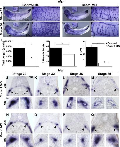 (A�H) In situ analysis with EC marker Msr of control and CASZ1-depleted embryos (stages 32�36; lateral view with anterior to the left). Vessel patterning and branching within the vvn are severely compromised at stage 32 in CASZ1-depleted embryos (A and C: high magnification of the vvn in B and D) and stage 36 (E and G: high magnification of the vvn in F and H). Note the poor sprouting of intersomitic vessels (isv) in CASZ1-depleted embryos at both stages (enlarged box in A, C, E, and G). n = 10 embryos/condition/stage, three independent experiments. pcv, posterior cardinal vein.
