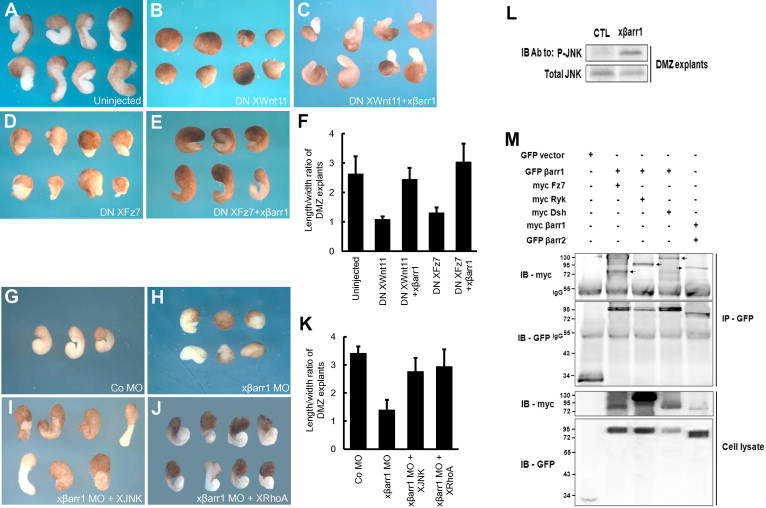 and (GâJ), respectively. (L) Immunoblotting (IB) analysis of the effect of xbarr1 on JNK activation. Total JNK serves as a loading control. (AâL) Two blastomeres of four-cell