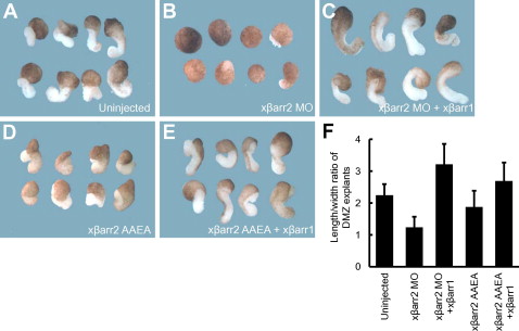 Fig. 4. xbarr1 substitutes for xbarr2 in regulation of CE. (AâE) In vitro elongation assays. (F) Quantitation of convergent extension of DMZ explants shown in (AâE). Four-cell