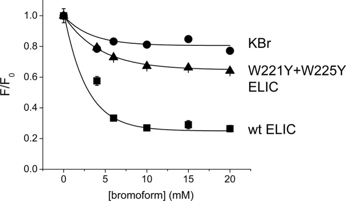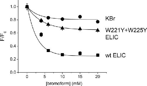 FIGURE 5. Quenching of intrinsic tryptophan fluorescence in ELIC by bromoform. Increasing concentrations of bromoform cause quenching of intrinsic fluorescence in ELIC. This effect is strongly reduced in the double mutant W221Y/W225Y. Each data point is the average of 3 experiments. Error bars indicate S.E. |