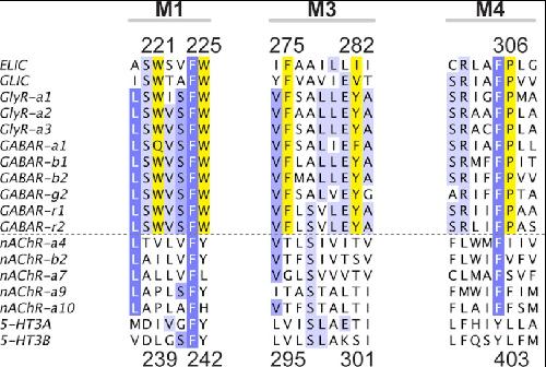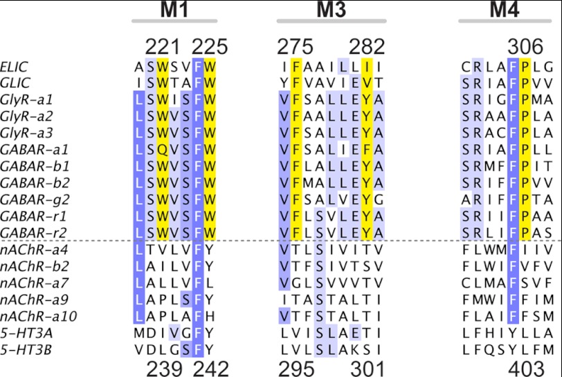 FIGURE 6. Conservation of bromoform binding residues at a transmembrane intersubunit site in pLGICs. Alignment of ELIC, GLIC, and selected sequences of human GlyR, GABAA/CR, nAChR, and 5-HT3Rs is shown. Numbers at the top of the alignment correspond to ELIC residues, and numbers at the bottom correspond to α1 GlyR residues. Residues are colored in shades of blue using an identity threshold of 50%. Yellow residues correspond to the highlighted residues in the intersubunit bromoform site in ELIC (Fig. 3d). Aromatic residues at these positions as well as Pro-307 are strongly conserved in GlyR and GABAA/CR, but not in nAChR and 5-HT3Rs. The dashed line separates inhibitory (top) from excitatory (bottom) receptors. |