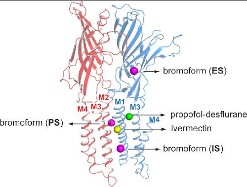 FIGURE 8. Overview of different general anesthetic binding sites revealed in crystal structures of pLGICs. A graphic representation of two neighboring subunits of the ELIC pentamer is shown. The different spheres correspond to different binding site for general anesthetics: the propofol-desflurane site (green) (18), the alcohol-ivermectin site (yellow) (14), and the three bromoform sites identified in this study (magenta). ES, extracellular site; PS, pore site; IS, intersubunit site). |