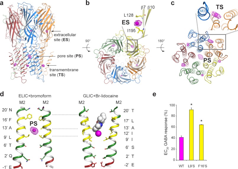 a, side view of ELIC in graphic representation and overlay with anomalous electron density, shown as magenta mesh at a contour level of 4σ. Each subunit of the pentamer is shown in a different color. Anomalous densities can be observed in the extracellular domain, transmembrane domain, and channel pore. b and c, extracellular and intracellular view of ELIC along the five-fold symmetry axis. The pore site is lined by the M2-helices of each of the five subunits. The transmembrane site is formed at the interface between two subunits, involving the M1- and M4-helix of one subunit and the M3-helix of the neighboring subunit. Bromoform molecules are represented as a single magenta sphere. d, comparison of the bromoform binding site in the closed channel pore of ELIC (left) and bromo-lidocaine binding site in the open channel pore of GLIC (right). Bromoform and bromo-lidocaine occupy overlapping binding sites, which are located in the hydrophobic part of the ion conduction pathway (hydrophobic residues are colored in yellow, hydrophilic residues are in green, and charged residues are in red). e, mutagenesis experiments in ELIC demonstrate that the inhibitory effect of 200 μm bromoform is almost completely eliminated in L9′S and strongly reduced in F16′S mutants. The inhibitory effect of bromoform was tested at an EC20 concentration of GABA, which was 0.5 mm for L9′S and 3 mm for wild type and F16′S. Error bars represent mean ± S.E. from 3–5 different experiments. Asterisks indicate significant difference from wild type (p < 0.05). |