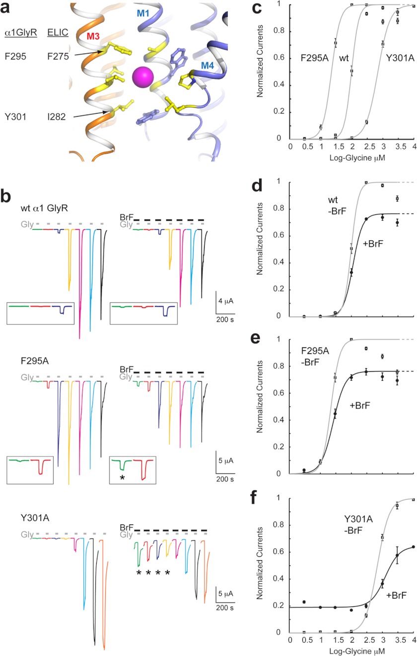 a, graphic representation of the intersubunit bromoform binding site in the transmembrane domain of ELIC. Interacting residues are shown in yellow sticks. The bromoform molecule is shown as a single magenta sphere. b, two-electrode voltage clamp recordings from oocytes expressing wild type α1 GlyRs, F295A, and Y301A mutants. Each current trace is shown in a specific color to facilitate comparison of the range of glycine concentrations: 3 μm (green), 10 μm (red), 30 μm (blue), 100 μm (yellow), 300 μm (magenta), 1 mm (cyan), and 3 mm (black). To reach saturation for Tyr-301 receptors, we also applied 10 mm (orange). Each oocyte was exposed to the same range of glycine concentrations in the presence of 200 μm bromoform (BrF). The insets for WT and F295A show a magnified view of traces obtained at low glycine concentrations. The asterisk indicates potentiation by bromoform. c, concentration-activation curves for WT, F295A, and Y301A GlyRs in the absence of bromoform. d–f, concentration-activation curves in the absence (gray line, −BrF) and presence (black line, +BrF) of 200 μm bromoform for WT (d), F295A (e), and Y301A (f) receptors. Error bars in panels c–f indicate S.E. |