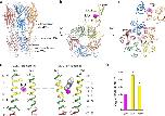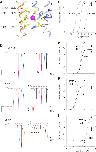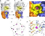 a and b, Comparison of the propofol binding site in GLIC (a) and the bromoform binding site of ELIC (b) in a surface representation. Propofol binds in an intrasubunit pocket in the upper half of the transmembrane domain. Bromoform binds in an intersubunit pocket farther down the transmembrane domain. The transmembrane domains of two neighboring subunits are shown in orange and blue. The propofol and bromoform pockets are highlighted in yellow. The extracellular domain is shown in white. The inset shows a more detailed view of the intersubunit transmembrane site. The magenta mesh represents anomalous electron density contoured at 4σ. c, cross-section through a surface representation of ELIC. The intersubunit bromoform site is formed at a pre-existing cavity, which is occupied by a bromoform molecule (single bromine atoms are shown as magenta spheres) in all five sites. d, detailed view of the amino acid residues in ELIC that form the intersubunit bromoform site (highlighted in yellow). The site is formed at the interface between M1 and M4 of one subunit (blue) and M3 of the neighboring subunit (orange). |