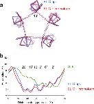 a, ribbon representation of the pore-lining M2-helix in the apoELIC structure (blue, PDB code 2vl0) and the bromoform-bound structure (red). The view is along the five-fold symmetry axis looking down on the channel pore from the extracellular domain. The dashed lines are distance measurements between 13′A Cα atoms of different subunits. b, pore radius analysis for apoELIC (blue), bromoform-bound ELIC (red), and GLIC, which likely corresponds to an open pore conformation (PDB code 3eam). |