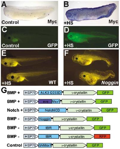 (E and F) Embryos heat-shocked at stage 14 develop normally in the absence of the HSP70-Noggin-γCrys-GFP transgene, whereas their transgenic siblings develop multiple defects consistent with BMP inhibition.