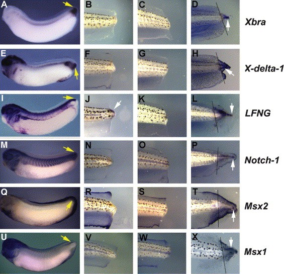 Figure 2. Analysis of Developmental Gene Expression in Nonregenerating and Regenerating Tail TissuesIn situ hybridization of genes involved in tail development.(A, E, I, M, Q, and U) Stage 30 embryos.(B, F, J, N, R, and V) Nonregenerating tail stumps, 50% amputated at stage 47 and fixed 3 days afterward.(C, G, K, O, S, and W) Stage 49 tail stumps, 50% amputated and fixed immediately.(D, H, L, P, T, and X) Regenerating tail stumps, 50% amputated at stage 49 and fixed 3 days later. Amputation level is shown by the black line.(AâD) Xbra is expressed in the developing tail bud (yellow arrow) and reexpressed in the tip of regenerating tails (white arrow).(EâH) X-delta-1 is expressed in the posterior wall of the tail bud (yellow arrow) and fin and is reexpressed in the fin and bud region (white arrow) of regenerating tails.(IâL) lfng is expressed in the dorsal tail bud (yellow arrow) and is expressed weakly at the cut surface of the spinal cord in nonregenerating tail stumps and more strongly in dorsal components of the regenerating tail (white arrows).(MâP) X-Notch-1 is expressed in somites, fin margin, and throughout the developing tail bud (yellow arrow) and is reexpressed in the blastema (white arrow), presomitic mesoderm, and fin margin.(QâT) Msx2 is expressed in the tail bud leading edge (yellow arrow) and reexpressed throughout the blastema (white arrow) and fin margin.(UâX) Msx1 is expressed in the dorsal tail bud (yellow arrow) and reexpressed dorsally in the regenerating blastema (white arrow). All are lateral views, oriented with anterior to the left.