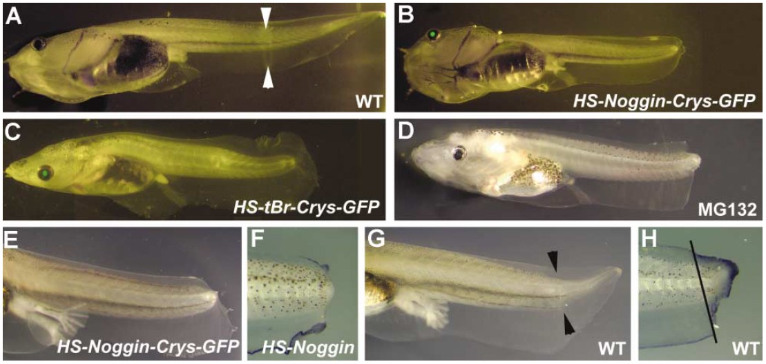 (A) Wild-type (WT) tadpoles as controls for transgenics. No regeneration of tail tissues from the stump has occurred.