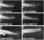 Figure 6. Epistasis Experiments Suggest that BMP Acts Upstream of Notch in Tail Regeneration (A-D) Effect of a Notch inhibitor on BMP pathway-driven refractory stage regeneration. Tadpoles were amputated at stage 47 and given daily heat shocks for 1 week. (A) Wild-type (WT) tadpoles do not regenerate at this stage.(B) Sibling tadpoles expressing the HSP70-Alk3-γCrys-GFP regenerate all the tail tissues.(C and D) Neither WT (C) nor transgenic tadpoles (D) will regenerate any tailtissue following treatment with 10 μM Notch proteolysis inhibitor MG132.(E and F) Effect of combined inhibition of BMP signaling and activation of the Notch pathway. The tadpoles express both HSP70-tBr-γCrys-GFP and HSP70-NICD-γCrys-RFP. Following amputation after stage 50, when WT animals regenerate tails normally, these double transgenics regenerate only notochord and spinal cord tissue. No new muscle is formed. White arrowheads mark the site of amputation in (B, E, and F).