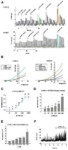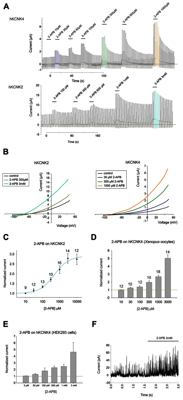 FIGURE 2. (A) Representative traces showing the effect of increasing concentrations of 2-APB on hKCNK4-expressing (top) and hKCNK2-expressing (bottom) Xenopus oocytes subjected to the ramp series protocol described in the experimental procedures. (B) Representative I–V traces for the excitatory effect of increasing concentrations of 2-APB on oocytes expressing hKCNK2 (left) and hKCNK4 (right). (C) Dose–response curve showing the effects of 2-APB on hKCNK2 and fitted to the 4-parameter Hill equation (n indicated above the points). (D) Dose–response relationship showing the effect of 2-APB on hKCNK4 (n indicated above the points). (E) Dose–response relationship showing the effect of 2-APB on hKCNK4 (n = 3–5 HEK293 cells). (F) Inside-out patch-clamp recordings of cell-excised patches from hKCNK4-expressing HEK293 cells before and after exposure to 3 mM 2-APB.