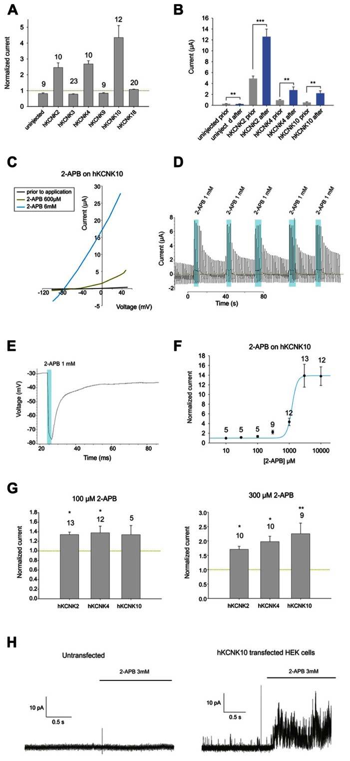 FIGURE 1. (A) Effect of 1 mM 2-APB on (from left to right) uninjected Xenopus oocytes and oocytes injected with cRNA coding for hKCNK2, hKCNK3, hKNCK4, hKCNK9, hKCNK10, and hKCNK18. For each group, the current registered at the final 50 ms of the +50 mV constant (see experimental procedures for a description of the ramp protocol used) was normalized to the current registered prior to the application of 2-APB (dotted line). All data are expressed as means ±SEM. Number of cells in each experiment is indicated above the bars. (B) Absolute currents registered in uninjected Xenopus oocytes and oocytes injected with cRNA coding for hKCNK2, hKCNK4, and hKNCK10, before and after the application of 1 mM 2-APB. (C) Representative I-V trace of a Xenopus oocyte expressing hKCNK10 before (black line), and after the application of 2-APB at 600 μM (green line), and 6 mM (blue line). (D) Ramp series measurement of a Xenopus oocyte expressing hKCNK10 that was repeatedly exposed to 1 mM 2-APB. The dotted green line represents zero current. (E) 1 mM 2-APB reversibly hyperpolarizes a Xenopus oocyte expressing hKCNK10. (F) Dose–response curve fitted to the 4-parameter Hill equation (n indicated above the points). (G) Effect of 2-APB at 100 μM (left) and 300 μM (right) on Xenopus oocytes injected with cRNA coding for hKCNK2, hKNCK4, and hKCNK10. Data were normalized to the current registered prior to the application of 2-APB (dotted line). All data are expressed as means ±SEM. Number of cells in each experiment is indicated above the bars. (H) Inside-out patch-clamp recordings of cell-excised patches from untransfected HEK293 cells (left) and HEK293 cells transfected with hKCNK10 (right) before and after exposure to 3 mM 2-APB.