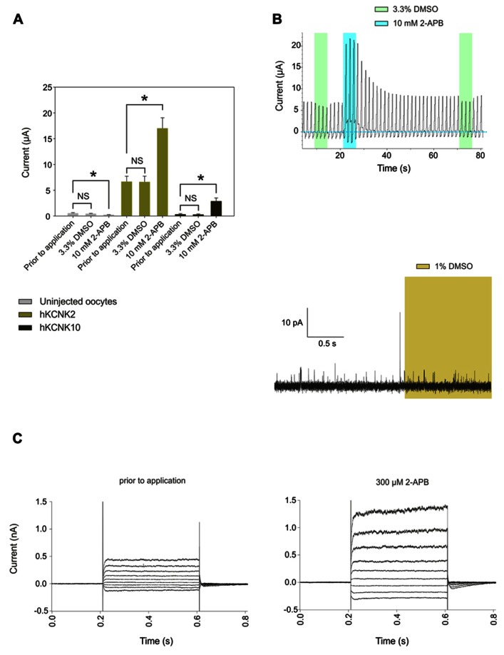 FIGURE 3. (A) Comparison of the effects of applying 100 μL frog Ringer’s solution containing 3. 3% DMSO vs. applying the same solution plus 10 mM 2-APB to uninjected oocytes (gray bars) or oocytes injected with cRNA coding for hKCNK2 (light green bars) and hKCNK10 (dark green bars) (n = 3–5 oocytes/group). The time of exposure was approximately 10 s. (B) Top: Representative voltage clamp recording from an oocyte expressing hKCNK2 exposed to vehicle solution (green rectangles) or the same solution plus 10 mM DMSO (blue rectangles). Bottom: Representative voltage clamp recording from an inside-out patch-clamp of a HEK293 cell expressing hKCNK10, before and after exposure to 1% DMSO (light green rectangle). (C) hKCNK4 currents recorded from a transfected HEK293 cell before (right) and after (left) the application of 300 μM 2-APB. Currents were elicited by voltage pulses from -110 to +50 mV in 20 mV steps, 400 ms in duration, from a holding potential of -60 mV.
