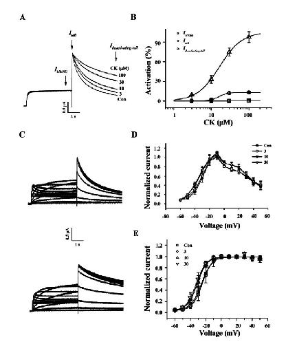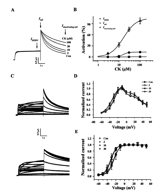 Fig. 2. Effects of compound K (CK) on IHERG, Itail, and Ideactivating-tail. (A) Representative current traces on human ether-a-go-go-related gene (HERG) K+ channel enhancements by various concentrations of CK. Currents were in response to 4-s voltage steps to 0 mV from a holding potential of –90 mV, followed by repolarization to –60 mV. IHERG was obtained at the end of depolarization; Itail was obtained at beginning of repolarization; slow Ideactivating-tail was obtained at the end of repolarization as indicated by arrow in (A). (B) Concentration-response curves for the activation of HERG K+ currents by CK on IHERG, Itail, and Ideactivating-tail. Solid lines were fitted to the Hill equation. CK was potent for the enhancement of Ideactivating-tail. Bars represent the means±SEM (n=5-7). (C) The representative control (upper traces) and 100 μM CK-mediated currents (down traces) in I-V relationship. Currents were recorded at test potential from –60 to + 50 mV. Itail and Ideactivating-tail were recorded after repolarization to –60 mV. (D) I-V relationships for HERG K+ currents measurement at the end of the 4-s test pulse before and after application of 3, 10, and 30 μM CK (n=5). Currents were normalized to the control current at 0 mV for each oocyte. Data are represented by the means±SEM (n=7). (E) Effects of CK on the steady-state activation curve for HERG K+ channel. Itail were normalized to the peak current under each condition, and the data were fitted with a Boltzmann function. Treatment of CK (10, 30, and 100 μM) did cause a leftward shift. Con, control.