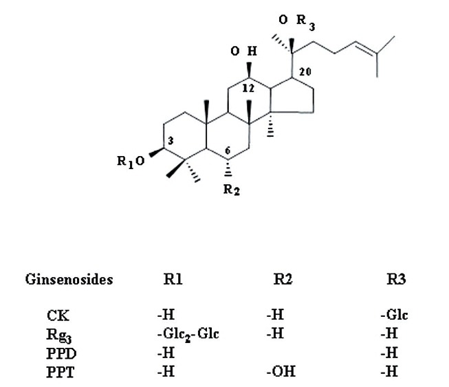 Fig. 1. Chemical structures of ginsenoside Rg3 and ginsenoside metabolites used in this study. CK, compound K; PPD, protopanaxadiol; PPT, protopanaxatriol; Glc, glucopyranoside.