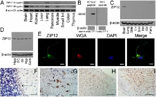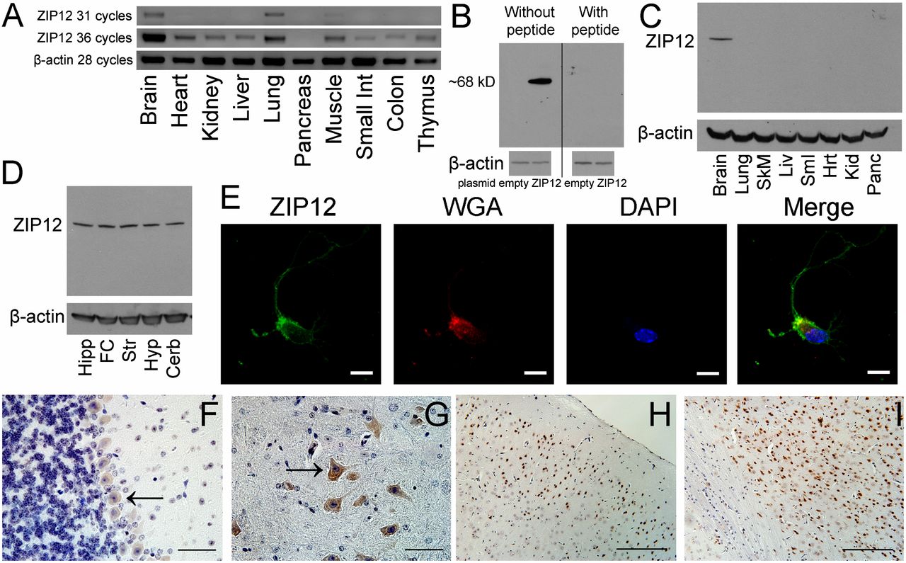 ZIP12 is primarily expressed in the human and mouse brain. (A) ZIP12 mRNA expression detected in various mouse tissues by RT-PCR. (B) Detection of mouse ZIP12 by immunoblotting in mZIP12-transfected CHO cells. (C and D) ZIP12 protein expression detected in various mouse tissue lysates (C) and brain region lysates (D) by immunoblotting. (C) Tissues include (from left to right): brain, lung, skeletal muscle, liver, small intestine, heart, kidney, and pancreas. (D) Brain regions include (from left to right): hippocampus (Hipp), frontal cortex (FC), striatum (Str), hypothalamus (Hyp), and cerebellum (Cerb). (E) ZIP12 is present at the plasma membrane in primary mouse neurons. (Scale bar: 10 μm.) (FâI) ZIP12 is present in coronal sections of various regions of the mouse brain. Brain regions include (F) cerebellum (including Purkinje cell layer), (G) medulla oblongata, (H) frontal cortex, and (I) corpus callosum (and cortex). Arrows in F and G indicate neuronal staining. [Scale bar: 50 μm (60à magnification) in F and G; 200 μm (20à magnification) in H and I.]