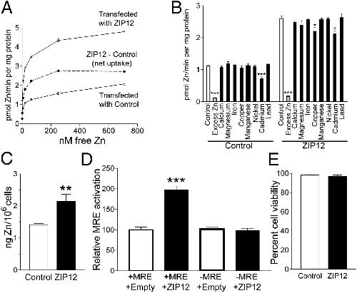 ZIP12 is a high-affinity, Zn2+- specific transporter. (A) Zn2+ uptake at different concentrations of free external Zn2+ by ZIP12 in CHO cells was measured using 65Zn (n = 3, ± SE). The curve marked ZIP12 â Control represents net Zn2+ uptake in ZIP12-transfected cells minus uptake in control-transfected cells. (B) Zn2+ uptake specificity of ZIP12 relative to other metals determined using 65Zn (n = 3, ± SE). Excess Zn2+ indicates cold Zn2+ added to uptake buffer during assay. (C) Increased Zn2+ content relative to cell number by ZIP12 was measured by ICP-MS (n = 6, ± SE). (D) ZIP12 increases MRE activation, measured by reporter assay (n = 6, ± SE). (E) ZIP12 overexpression does not affect cell viability at 48 h posttransfection, measured by Trypan blue exclusion (n = 6, ± SE). **P P