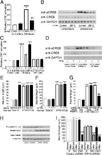 ZIP12 is required for CREB signaling and tubulin polymerization. (A and B) Differentiation of N2a cells increases cAMP response element (CRE) activation (n = 6, ± SE) and CREB phosphorylation, both of which are blunted by ZIP12 shRNA-mediated knockdown. ***P ##P C) Extracellular Zn2+ chelation by DTPA mimics the blunting of CREB activation in differentiated cells induced by ZIP12 shRNA knockdown (n = 6, ± SE). ***P ##P +++P D) Intracellular Zn2+ chelation by TPEN reduces phosphorylation of CREB regardless of ZIP12 shRNA knockdown. (E) Constitutive activation of CREB by VP16-CREB1 transfection increases neurite extension in the absence of RA. ***P F and G) Neurite outgrowth induced by constitutive activation of CREB is not affected by (F) extracellular Zn2+ chelation or (G) ZIP12 shRNA-mediated knockdown. ***P ###P H) ZIP12 knockdown alters soluble and polymerized tubulin fractions in N2a cells without affecting total tubulin protein expression. (I) ZIP12 knockdown in differentiated N2a cells increases sensitivity to neurite retraction following microtubule destabilization by nocodazole (n = 50, ± SE). ***P