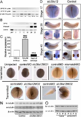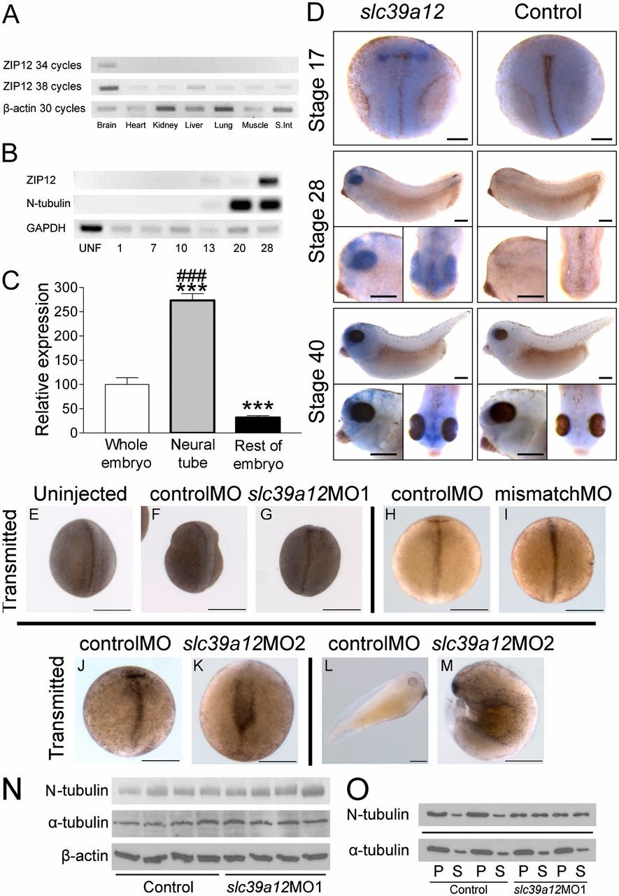 Fig. 5. ZIP12 is expressed primarily in the neural tube and brain of X. tropicalis and is required for neural tube closure and embryonic viability. (A and B) ZIP12 and β-actin or GAPDH expression was determined in various adult tissues and developmental stages by RT-PCR. (C) ZIP12 mRNA expression is elevated in the neural plate, as determined by quantitative RT-PCR (n = 6, +/- SE). ***P < 0.001 versus whole embryo; ###P < 0.001 versus rest of embryo. (D) ZIP12 mRNA (slc39a12) is expressed during neurulation and early nervous system development, analyzed by in situ hybridization. (E-M) ZIP12 knockdown by antisense morpholino microinjection impairs X. tropicalis development during neurulation. (N) Microinjection of slc39a12MO1 does not affect tubulin protein content, analyzed by immunoblotting. (O) Microinjection of slc39a12MO1 affects the ratio of polymerized to soluble β2-tubulin, as analyzed by polymerized tubulin fractionation and immunoblotting. (Scale bars: 250 μm in all images.)