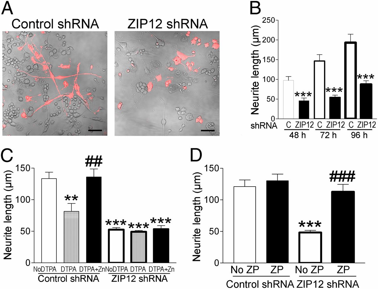 Neurite extension is dependent on Zn2+ transport by ZIP12 and is affected by Zn2+ availability. (A and B) ZIP12 shRNA reduces neurite length in N2a cells (n = 50, ± SE). (C) Chelation of extracellular Zn2+ with DTPA mimics the impairment of ZIP12 knockdown on neurite length in N2a cells (n = 50, ± SE). (D) Zn2+ carrier pyrithione (ZP) restores neurite outgrowth impaired by ZIP12 shRNA knockdown in N2a cells (n = 50, ± SE). (Scale bars: 100 μm.) **P P ##P ###P