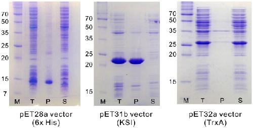 Figure 2. Expression of DkTx in E. coli.SDS-PAGE gels (15%) were stained with Coomassie Blue. Lane M, molecular weight markers (kDa); lane T, total cell lysate; lane P, pellet fraction; lane S, soluble fraction.