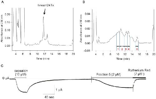 Figure 3. Purification and activity of the DkTx folding product.(A) Purification of linear DkTx. Cleavage of the fusion protein and reduction of the disulfide bond were accomplished using hydroxylamine and DTT, respectively, as described in methods. (B) Linear DkTx was folded in 1 M NH4OAc (pH 8.0) buffer containing 1 M GdnHCl, 1 mM EDTA, 2.5 mM GSH and 0.25 mM GSSG for 5 days at 4°C. The toxins were purified using a linear gradient of 29–44% solvent B for 15 min at a flow rate of 14 ml/min, where solvent A was water containing 0.1% TFA and solvent B was acetonitrile containing 0.1% TFA. (C) Fraction 5 activated TRPV1 expressed in oocytes. Holding voltage was −60 mV.