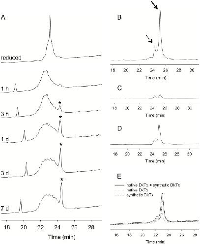 Figure 4. HPLC profiles of DkTx during the folding reaction.The peptides were separated using a linear gradient of 5–65% solvent B for 30 min at a flow rate of 1 ml/min, where solvent A was water containing 0.1% TFA and solvent B was acetonitrile containing 0.1% TFA. (A) Oxidative folding of DkTx in redox buffer was monitored by HPLC. Asterisks indicate correctly folded DkTx. (B) HPLC chromatogram of purified DkTx. Dashed and solid arrows indicate the minor and major forms of DkTx, respectively. (C) The minor form was collected and re-injected after 75 min. (D) The major form was collected and re-injected after 175 min. (E) Co-injection of native and synthetic DkTx.