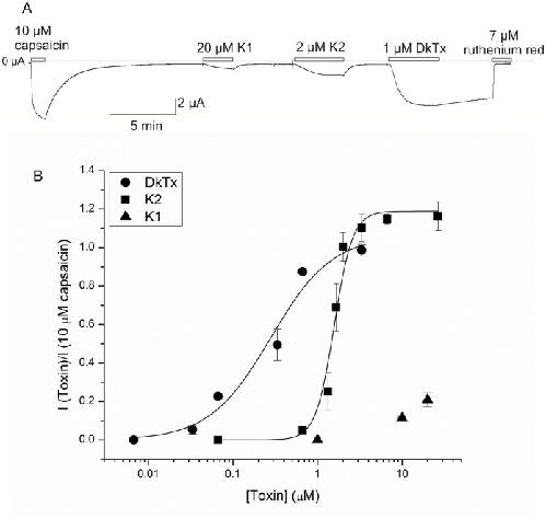 Figure 6. Activity of K1, K2 and DkTx on TRPV1 channels.(A) Synthetic K1, K2 and DkTx activate TRPV1 channels. Oocytes were held at −60 mV and toxins were added to the recording chamber. (B) Concentration-dependence for activation of TRPV1 by the toxins.