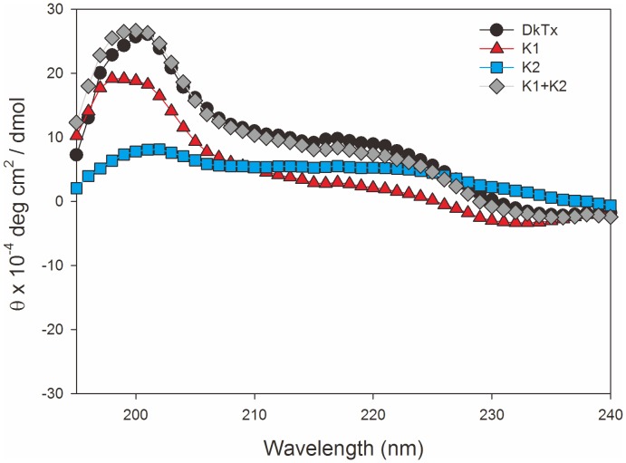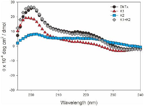 Figure 7. CD spectra of K1, K2 and DkTx.The CD spectra were recorded in 0.01 M sodium phosphate (pH 7.0) at 20°C. K1+K2 depicts the added values of the CD spectra from K1 and K2.