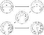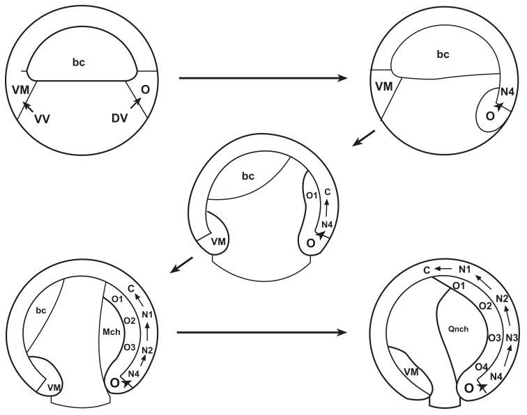 Fig. (3). The vertebrate A-P pattern is initiated during gastrulation. Drawings from an Amphibian embryo. From [9]. Top left, late blastula stage, just before gastrulation. Top right and the rest: successive stages through gastrulation, in the order indicated by the arrows. VM: ventral mesoderm, O: organiser mesoderm. VV: ventral endoderm DV: dorsal endoderm. Bc: blastocoels, arch: archenteron. O1, O2, O3, O4 successive A-P levels generated in the mesoderm during gastrulation, from anterior to posterior N1, N2, N3, N4: successive A-P levels in the developing central nervous system, generated in parallel with the mesodermal pattern by vertical signalling. |