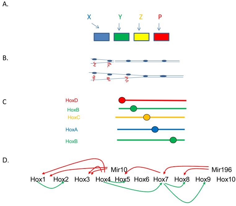 Fig. (5). Some facts and ideas about Hox colinearity. A. Upstream mechanism needed to generate spatial collinearity. In the case that there is no explicit colinearity mechanism, an individual input is needed to turn on each Hox gene to ensure it is expressed at exactly the right axial position. The inputs concerned are going to need an axial pattern themselves. This kind of mechanism is used in Drosophila, where the gap genes and segmentation genes provide the spatial inputs. Gap genes specify the primary axial positions where the Hox genes are expressed and segmentation genes, the Hox genes themselves, polycomb group genes and cofactors like teashirt refine this information, restricting Hox expression by specific segment boundaries. In this situation, the Hox genes thus do not provide the primary axial patterning information. They are secondary. It is likely that this kind of mechanism is general in invertebrates, which usually have no temporal colinearity or colinearity mechanism and have had to evolve an ad hoc mechanism to generate spatial collinearity. Something like this may also occur in the vertebrate hindbrain, where the gastrula’s colinearity mechanism is presumably the primary patterning mechanism and hindbrain genes confirm or alter the patterning information. B. Progressive chromatin opening: the basic idea. This is an idea proposed by Duboule and colleagues to account for vertebrate temporal collinearity. The Hox complex chromatin opens from 3’ to 5’. This opening progressively permits Hox gene transcription, from 3’ to 5’. C. Hox interactions.What regulates vertebrate temporal collinearity? Not just chromatin opening, as proposed by Duboule. The different vertebrate Hox clusters are expressed with synchronous temporal collinearity in the gastrula. The X axis shows time, increasing downwards. The Y axis shows 3’ to 5’ position in a Hox cluster. The figure shows that genes in different clusters are included in the same, temporally collinear sequence. D. What may be involved here are cross interactions between different Hox genes. The figure shows some of the interactions between Hox genes that occur in the vertebrate gastrula. E. A biological clock (the somitogenesis clock) may ensure the timing of Hox temporal collinearity [61]. Periodic pulses of X Delta2 may induce expression of particular Hox genes in NOM mesoderm during gastrulation and later. |