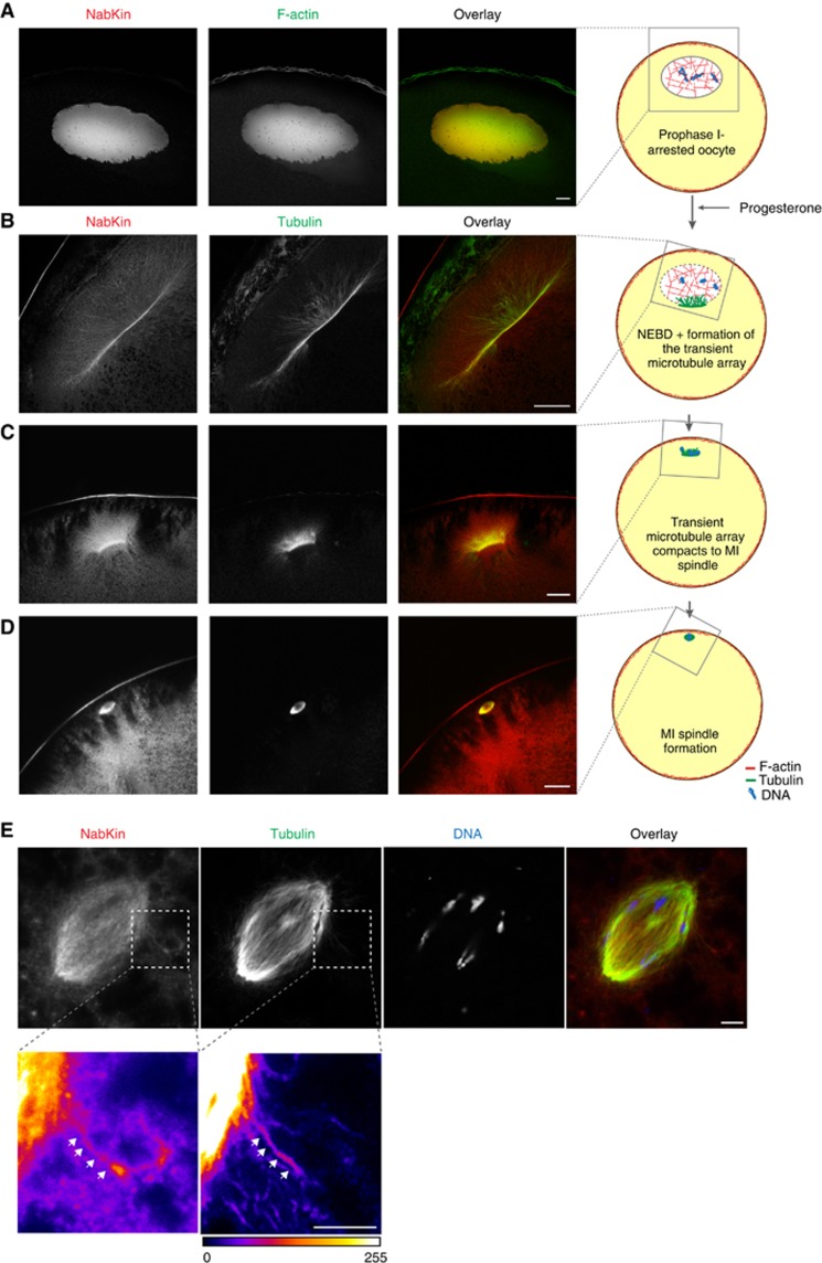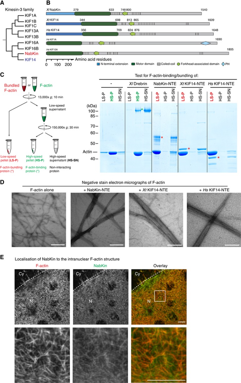 Nuclei of Xenopus laevis oocytes grow 100 000-fold larger in volume than a typical somatic nucleus and require an unusual intranuclear F-actin scaffold for mechanical stability. We now developed a method for mapping F-actin interactomes and identified a comprehensive set of F-actin binders from the oocyte nuclei. Unexpectedly, the most prominent interactor was a novel kinesin termed NabKin (Nuclear and meiotic actin-bundling Kinesin). NabKin not only binds microtubules but also F-actin structures, such as the intranuclear actin bundles in prophase and the contractile actomyosin ring during cytokinesis. The interaction between NabKin and F-actin is negatively regulated by Importin-β and is responsive to spatial information provided by RanGTP. Disconnecting NabKin from F-actin during meiosis caused cytokinesis failure and egg polyploidy. We also found actin-bundling activity in Nabkin's somatic paralogue KIF14, which was previously shown to be essential for somatic cell division. Our data are consistent with the notion that NabKin/KIF14 directly link microtubules with F-actin and that such link is essential for cytokinesis.