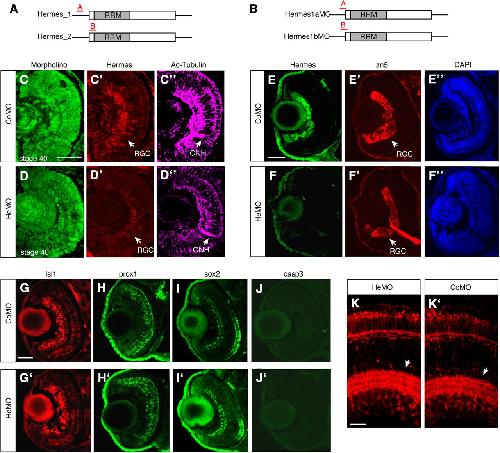 Figure 3. Hermes-depletion does not alter RGC specification and development. A, B, Translational blocking antisense MOs designed for Xenopus (A) and zebrafish (B) were used to knock down Hermes expression in the retina. C, D, Stage 40 retinal sections exhibit strong FITC-tagged MOs (green) signal throughout, indicative of robust intracellular loading following blastomere injections. C′, C″, D′, D″, MO-loaded Xenopus retinas coimmunostained for Hermes (C′, D′) and Ac-tubulin (C″, D″) show a severe loss of Hermes signal in the HeMO-loaded retina (D′) compared to control (CoMO; C′), but normal formation of the RGC layer and ONH (C″, D″). E–F″, Transverse sections of 56 hpf CoMO or HeMO injected zebrafish embryos coimmunostained for Hermes (E, F), zn5 (E′, F′), and DAPI (E″, F″). G–J′, Zebrafish retinal sections (56 hpf) of CoMO- or HeMO-injected embryos stained with antibodies to Isl1 (G, G′), prox1 (H, H′), Sox2 (I, I′), and Caspase-3 (J, J′). K, K′, Retinal sections of atoh7:RFP transgenic CoMO-injected (K) or HeMO-injected (K′) zebrafish embryos showing RGC dendrite sublamination in the IPL at 5 dpf. Scale bars: (in C, E, G) C–J′, 100 μm; (in K) K, K′, 25 μm. |