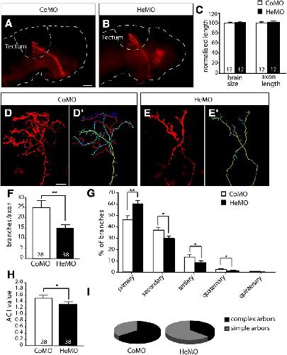 Figure 4. Hermes knockdown inhibits axonal branching in Xenopus. A–E, Embryos were blastomere injected with CoMO or HeMO and fixed at Stage 43. RGC axons labeled by eye-targeted RFP electroporation at Stage 28. Lateral view of whole-mount brains showing RFP-labeled retinotectal projections in CoMO- (A) and HeMO-injected embryos (B). There are no significant defects in long-range guidance, brain size, or axon length (C). Single RFP-labeled retinal axon terminals are highly branched in CoMO-injected embryos (D), but only sparsely branched in HeMO-injected (E) embryos. The corresponding outlines of each terminal arbor are shown in D′ and E′, where branches of a different order are color coded: yellow, axon shaft; cyan, primary; red, secondary; blue, tertiary. F–I, Hermes depletion leads to a significant reduction in average number of branches per axon (F), percentage of branches at all branch orders (G), and arbor complexity (H, I). Simple arbors, ACI < 1.4; complex arbors, ACI ≥ 1.4. Error bars represent SEM. *p < 0.05; **p < 0.01; Mann–Whitney test. The numbers of projections (C) or axons (D–I) analyzed are indicated on the bars. Scale bars: (in A) A, B, 50 μm; (in D) D–E′, 20 μm. |